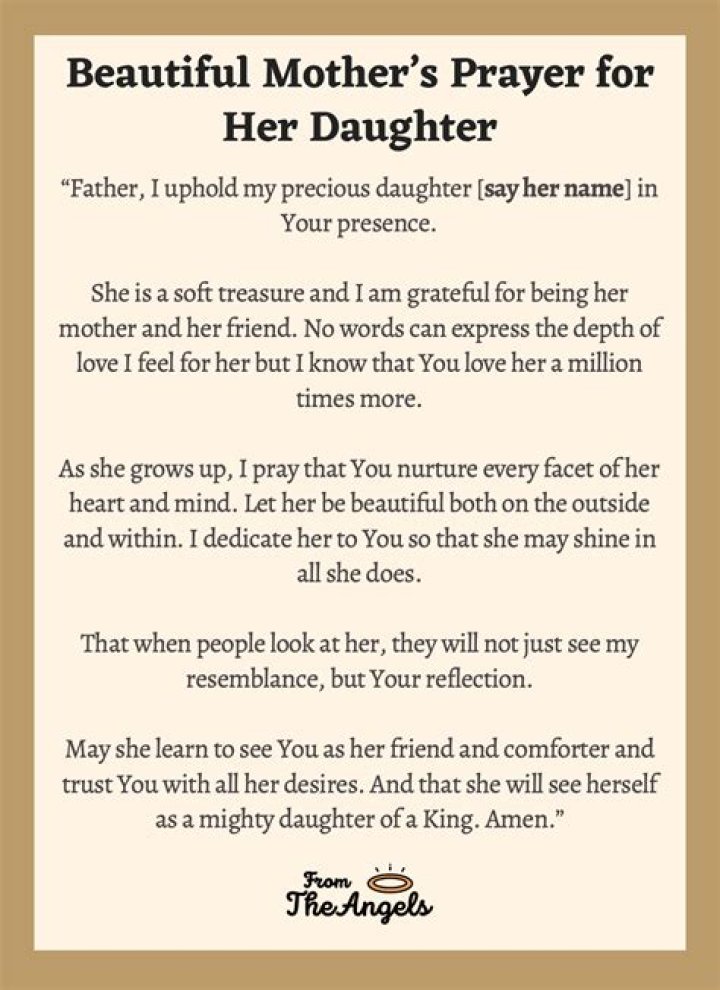 - Spiritual protection: Daughters pray for their mothers to be protected from spiritual harm, such as temptation, evil, or doubt. They pray for their mothers to have a strong faith in God, and to be able to resist the forces of darkness.