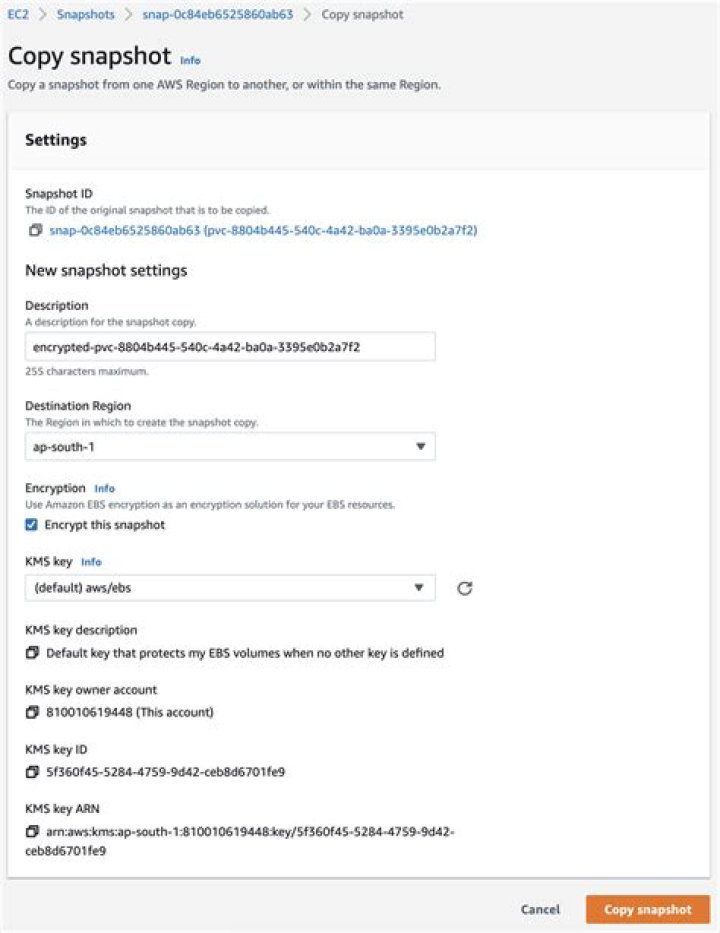 When copying snapshots to a Region, copies of encrypted EBS snapshots remain encrypted. Copies of unencrypted snapshots remain unencrypted, unless you enable encryption for the snapshot copy operation. By default, encrypted snapshot copies use the default Key Management Service (KMS) KMS key; however, you can specify a different KMS key. To copy an encrypted snapshot that has been shared from another account, you must have permissions for the KMS key used to encrypt the snapshot.