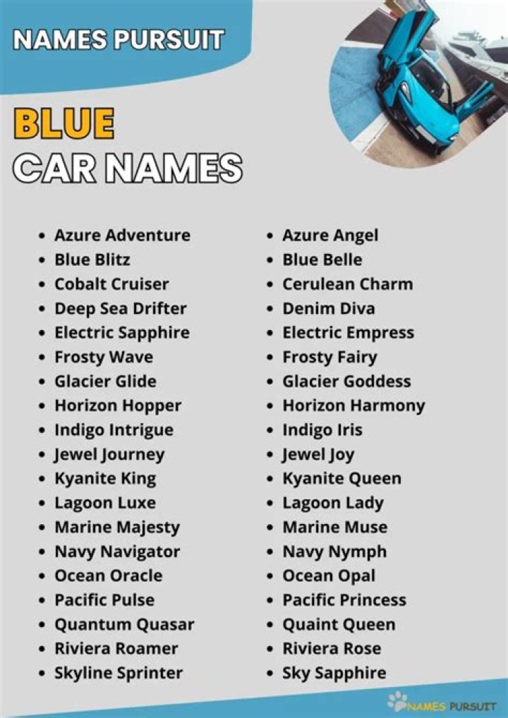 When considering names for a blue car, many factors come into play, such as the shade of blue, the make and model of the car, and the personality of the owner.